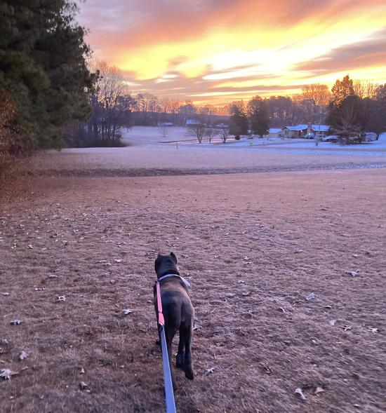 Dog walking volunteer Amanda took a photo of Evie out for her early morning stroll. We are so thankful for the volunteers who help us and take the dogs for a walk. If you would like to volunteer, please contact us. .